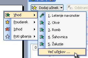 Kliknite na gumb Dodaj učinek ter izberite Vhod in Letenje navznoter. |