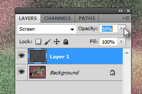 Sedaj pa layerju določite senčenje na Screen in Opacity 50% (glej sliko).