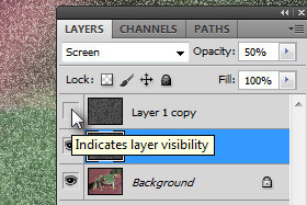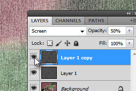 Potem pa označite spodnji layer in kliknite na ikono z očesom pri ravnokar ustvarjenem layerju, da ga boste skrili (glej sliko). Spodnji layer naj bo označen. |