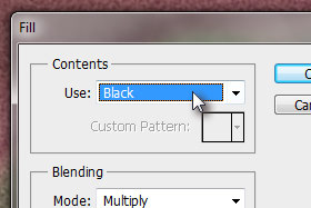 V novem oknu Use preko izbirnika določite Black in kliknite na gumb OK. S tem ukazom ste zapolnili dokument oziroma nov layer s črno barvo. |