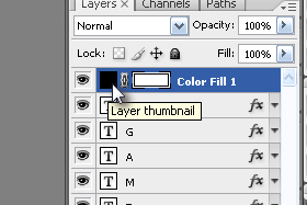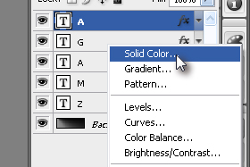 Izberite layer zgornje oz. zadnje črke, in kliknite spodaj na gumb Create new fill or adjustment layer.