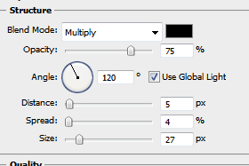 Senco sem dodal tako, da sem kliknil desni gumb na layer z napisom in izbral Blending Options, obkljukal sem Drop Shadow in določil takšne vrednosti.