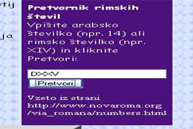 Ta pretvornik nam omogoča,da lahko arabsko število spremenimo v rimsko.Npr.525=DXXV. To naredimo tako, da napišemo število in pritisnemo gumb Pretvori. |
