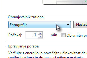 Do tega okna lahko pridete tudi tako, da na vaše namizje kliknete z desnim miškinim gumbom in izberete Prilagodi (in nato v novem oknu Ohranjevalnik zaslona). Potem pa preko izbirnika določite Fotografije (glej sliko). |