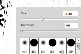 ![]() Kliknite z desnim miškinim gumbom na dokument in izberite poljubno velik čopič (Size) in nastavite Hardness na 0% (glej sliko). |