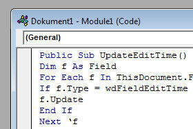 Public Sub UpdateEditTime() Dim f As Field For Each f In ThisDocument.Fields If f.Type = wdFieldEditTime Then f.Update End If Next ‘f Application.OnTime Now + TimeValue(“00:01:00”), “UpdateEditTime” End Sub |