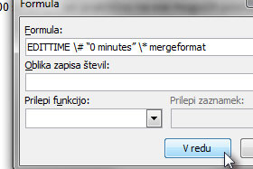V polje Formula izbrišite znak za je enako in vpišite nato EDITTIME \# "0 minut" \* mergeformat (glej sliko).