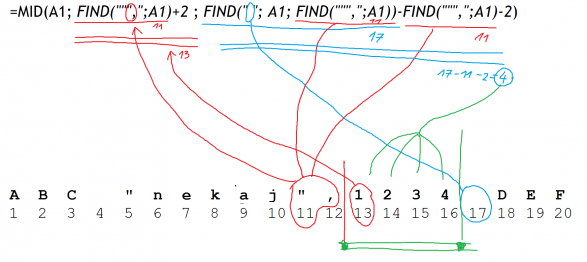=MID(A1;FIND(""",";A1)+2;FIND(" ";A1;FIND(""",";A1))-FIND(""",";A1)-2)Zdaj kako vam razložiti to ... Morda jaz malo kompliciram ampak na tak način mi vedno uspe napisat kakršnokoli izražanje ... Skratka ja ... Če razčlenimo ... Torej poglejte sliko. Spodaj (krepko) je pač neko vaše besedilo, pod tem pa so zaporedne številke znakov v tem besedilu. Glavna fukncija je Mid. Kot prvi argument sprejme A1 (besedilo v katerem se išče), kot drugi argument ji podamo začetek naše želene besede. Začetek dobimo s funkcijo find, ki poišče naš želeni znak ", (v funkciji je napisano kot """," - to je, ker želite iskati narekovaj!). +2 tukaj na začetku in -2 na koncu sta samo neka koeficienta oziroma offset. Funkcija kot vidite vrne 11, mi pa poterbujemo besedo, ki se začne za 2 mesti naprej. Torej začetek besede imamo postavljen kot 13 Zadnji argument glavne funkcije mid pa je število znakov, ki jih potrebujemo. To dobimo tako: Prva funkcija mid poišče presledek v vašem besedilu, vendar smo ji dodali še tretji argument FIND(""",";A1) - zakaj? Zato, ker bi se lahko presledek pojavil že v začetku vašega besedila, mi pa potrebujemo tistega tam bolj zadaj Zato s tole funkcijo dobimo spet številko 11, ki funkciji find pove, da naj išče presledek od 11 znaka naprej. Tako ne bo našla kakšnih presledkov na začetku besedila, ki jih ne potrebujemo. Torej ta funkcija FIND vrne število 17 - to je mesto, kjer se nahaja naš presledek, ki ga želimo uporabiti tudi kot konec žečenega besedila. To pa seveda še ni dovolj. Potrebujemo namreč število znakov tukaj vmes. To izračunamo tako, da od pozicije presledka odštejemo pozicijo našega začetka ", - 11, kot sem že prej omenil pa dodamo še tale offset, ki pravilno postavi konec ... Če bi torej vrhnjo mid funkcijo sedaj malce okrajšali in to, bi dobili: =MID(A1; 13; 4)Kar nam torej res vrne številko 1234, ki jo želimo poiskati. Am ... Sem zakompliciral? Ja. Poskusite ob branju spremljati na sliki spremenil: kljuka (19.1.2011 ob 22.37.58)
