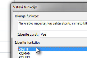 ![]() Odpre se novo okno, kjer določite zvrst Vse in nato označite funkcijo RIGHT. |