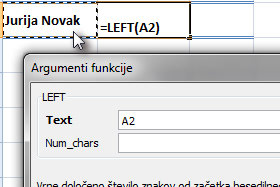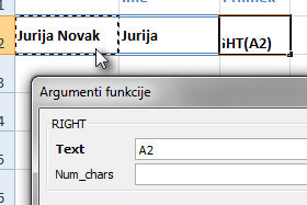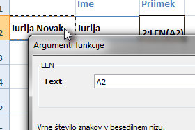 ![]() Prikaže se okno z argumenti funkcije, kjer za polje Text označite celico z imenom in priimkom. |