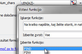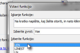![]() Odpre se novo okno, kjer določite zvrst Vse in nato označite funkcijo LEN. |
