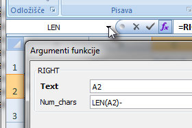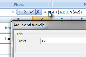 ![]() Zgoraj v vrstici za vnašanje formule (glej sliko) kliknite na RIGHT, da se boste postavili na začetek funkcije. |