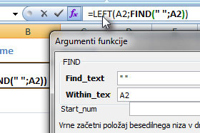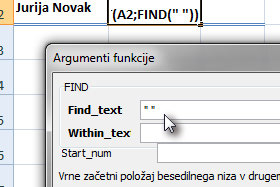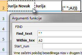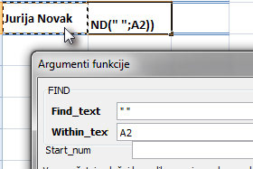 ![]() Sedaj smo določili, da naj Excel v celici z imenom in priimkom najde presledek. |