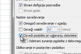 Odpre se novo okno, kjer označite Osveži podatke pri odpiranju datoteke.