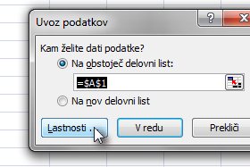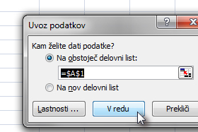 V Excelu se bo prikazalo okno, kjer vas program vpraša kam želite uvoziti podatke.