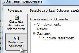 ![]() Odpre se okno za vstavljanje hiperpovezave, kjer kliknete na gumb Mesto v tem dokumentu. |