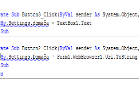 My.Settings.Domača = TextBox1.Text (Razlaga: My.Settings.Domača je Textbox1.Besedilo) Kliknite na drugi gumb in vnesite tole: My.Settings.Domača = Form1.WebBrowser1.Url.ToString (Razlaga: My.Settings.Domača je Lokacija Webbrowser1 v Oknu1) POZOR! Za napake se še ne zmenite! Če kaj ne boste razumeli, pišite na forum... |