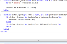 Private Sub Button6_KeyDown(ByVal sender As Object, ByVal e As System.Windows.Forms.KeyEventArgs) Handles Button6.KeyDown If e.KeyCode = Keys.Enter And ComboBox1.Text <> WebBrowser1.Url.ToString Then WebBrowser1.Navigate(ComboBox1.Text) End If If e.KeyCode = Keys.Enter And ComboBox1.Text = WebBrowser1.Url.ToString Then End If End Sub Če kaj ne boste razumeli, pišite na forum... POZOR: Naredite kot v prejšnjem koraku, samo skopirajte! |