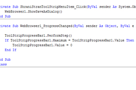 Private Sub ShraniStranToolStripMenuItem_Click(ByVal sender As System.Object, ByVal e As System.EventArgs) Handles ShraniStranToolStripMenuItem.Click WebBrowser1.ShowSaveAsDialog() End Sub Private Sub WebBrowser1_ProgressChanged(ByVal sender As Object, ByVal e As System.Windows.Forms.WebBrowserProgressChangedEventArgs) Handles WebBrowser1.ProgressChanged ToolStripProgressBar1.PerformStep() If ToolStripProgressBar1.Maximum = ToolStripProgressBar1.Value Then ToolStripProgressBar1.Value = 0 End If End Sub Če kaj ne boste razumeli, pišite na forum... |