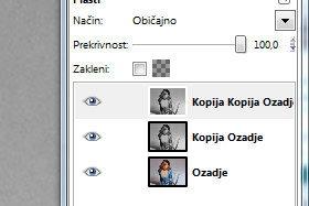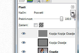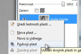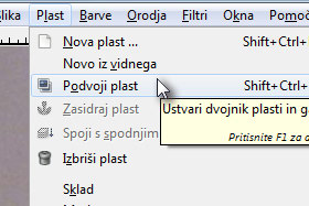 Kliknite na Plast in izberite Podvoji plast. V paleti plasti morate sedaj imeti tri plasti. |