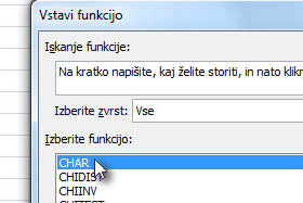 Odpre se novo okno, kjer kot zvrst določite Vse in nato označite funkcijo CHAR.