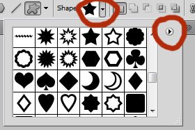 ![]() Sedaj ustvarite nov layer in izberite "Custom Shape Tool" (Bližnjica je U). Potem kliknite na "Shapes" in na malo puščico v desno. Odpre se nam nova izbira. Izberite "Symbols". Prikažejo se nam nove sličice.