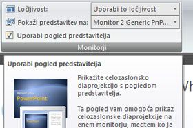 ![]() Nato pa v polju Monitorji obkljukajte Uporabi pogled predstavitelja. V spustnem seznamu Ločljivost lahko izberete pri kakšni ločljivosti naj se predvaja diaprojekcija, pri spustnem seznamu Pokaži predstavitev na, pa določite zaslon na katerem naj se diaprojekcija predvaja, v kolikor imate na računalnik priklopljenih več zaslonov. Če računalnika niste priklopili na projektor ali zunanji zaslon funkcija ne bo delovala in prikazalo se bo opozorilo, da je funkcija namenjena več kot le enemu zaslonu. Če ste računalnik priklopili na projektor ali zaslon in se pojavi to opozorilo, kliknite na gumb Preveri, če želite preveriti ali vaš računalnik lahko prikazuje na več monitorjih. |