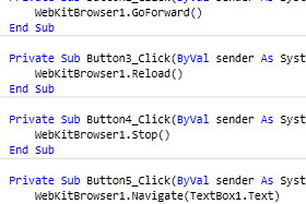 Naprej: WebKitBrowser1.GoForward() Osveži: WebKitBrowser1.Reload() Stop: WebKitBrowser1.Stop() Išči: WebKitBrowser1.Navigate(TextBox1.Text)