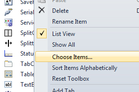 Odprite okno z orodji (toolbox) in desno kliknite na eno od orodij. Nato kliknite na Choose items. |