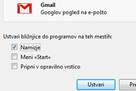 V pojavnem oknu izberite kam vse želite bližnjico ustvariti; namizje, meni Start, opravilna vrstica in kliknite na gumb Ustvari.