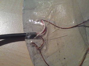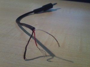 Žico z jack vhodom dobite v vsaki računalniški trgovini, priporočam jack-jack kabel (cca. 1€) in ga prerežete na pol, tako dobite 2 žice za 2 zvočnika. ;)
