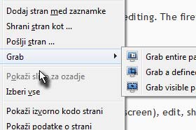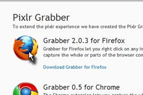Ko si dodatek namestite za vaš spletni brskalnik, ta omogoča da ko z desnim miškinim gumbom kliknete kjer koli na stran in izberete možnost Grab, vam ta omogoča da celotno stran ali pa poljubno označen del strani prenesete v spletni urejevalnik Pixlr za nadaljnje urejanje, ali pa si stran takoj shranite na vaš računalnik.