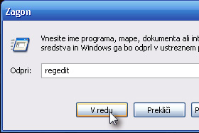 Kliknite Start, zaženi... (run...), vpišite regedit ter kliknite V redu.