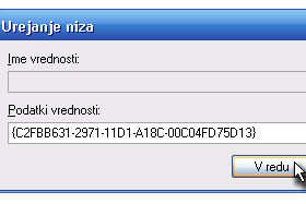 V drugi okvirček napišite (prepišite res pazljivo in pazite na velike črke!): {C2FBB630-2971-11D1-A18C-00C04FD75D13} Nato kliknite V redu. Zdaj smo dodali ključ Kopiraj v mapo... |