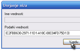 {C2FBB631-2971-11D1-A18C-00C04FD75D13} Kliknite V redu. Dodali smo ključ Kopiraj v mapo... Spet pazite na veliko začetnico. Ko boste vpisali kodo in kliknili V redu lahko zaprete Urejevalnik registrov (samodejno se shrani). |