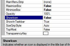 Najprej poimenujemo "Form1" v karkoli želite (v mojem primeru je to "Program", ter vrednosti "Minimize form" in "Maximize form" ter "Show icon" nastavimo na "False"