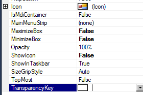 Potem "Form1" preimenujemo v karkoli želite, ter vrednosti "MaximizeBox", "MinimizeBox" ter "ShowIcon" nastavimo na "False"