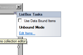 Zdaj bomo v okno dodali predmet "ListBox". V njega pa dodajte programe, ki jih veliko uporabljate (npr. Google Chrome, Visual Basic, Call of Duty 2, itd.). Programe dodate tako da kliknete na trikotnik, potem pa na tekst "Edit items". Potem se vam odpre okno kamor vpisujete programe, ločite jih pa z tipko "Enter".