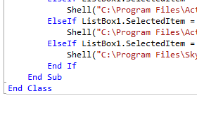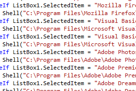 'Če je Listbox1.izbranpredmet "Ime predmeta TOČNO kot je v listbox(tudi velike in male črke) potem Shell("Pot do programa") 'Komanda za zagon programa ("Pot do programa, vključno z končnicami npr. .exe .txt . ink itd.") End If "