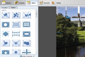 V zavihku Effect lahko urejamo tranzicije med slikami. Željeno tranzicijo primemo in odnesemo z miško med slike, katere smo izbrali.