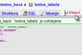 ![]() Sedaj bomo tej bazi dodali tabelo, v kateri bodo shranjeni naši podatki. |