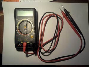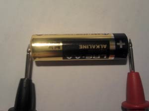 ![]() Na vsako stran baterije sedaj naredimo kontakt s konicami kablov, ki so povezani v multimeter. |
