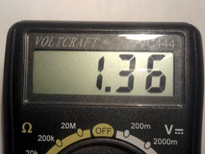 ![]() Na multimetru lahko sedaj preberemo, kakšna je napetost naše baterije. Sam sem tako izmeril napetost 1,35 volta. |