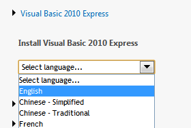 Tam izberemo "Install Visual Basic 2010 Express" ter izberemo jezik.
