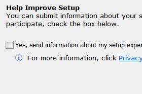 Ko se nam program odpre, odstranimo kljukico pri "Yes, send information about my setup experiences to Microsoft Corporation." ter kliknemo na gumb "Next"