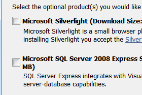 V kolikor pa nameravate programirati tudi z bazami, potem lahko obkljukate tudi Microsoft SQL Server 2008 Express Edition. Za nadaljevanje kliknemo na gumb "Next". |