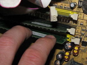 ![]() Sedaj na eni strani položimo prste na vrh ploščice ter pritisnemo navpično dol, da se pomnilnik do konca pogrezne v ležišče. |