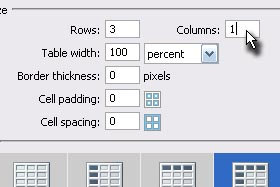 Določite naslednje. Row: 3, Columns: 1, Table width: 100 percent, Border thickness: 0, Cell padding: 0 in Cell spacing 0. Potrdite še na gumb OK. |