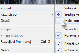 ![]() Z desnim miškinim gumbom kliknemo na prazen prostor na Namizju ter v prikazanem meniju izberemo možnost Pogled -> Male ikone. |