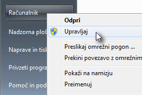 To najlažje storimo tako, da kliknemo na Start gumb in z desnim miškinim gumbom kliknemo na Računalnik in izberemo možnost Upravljaj.